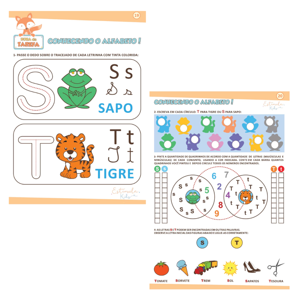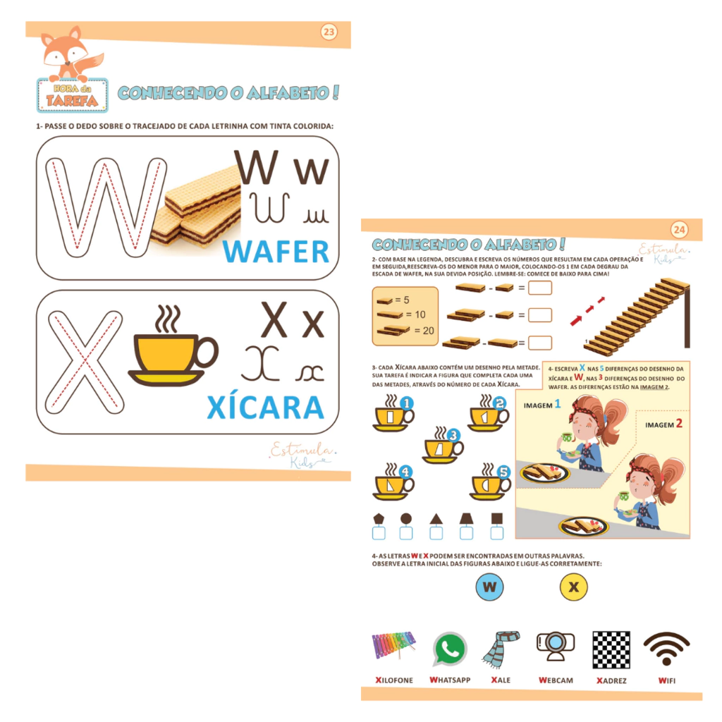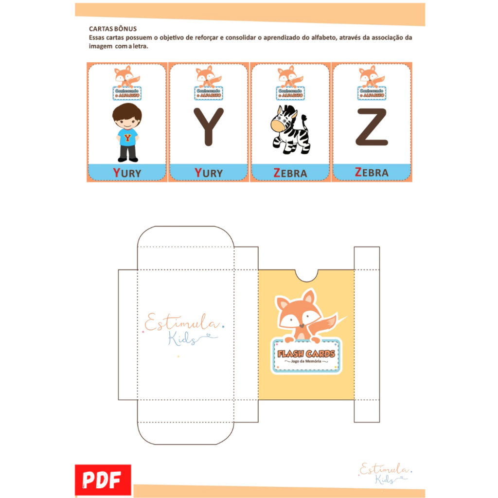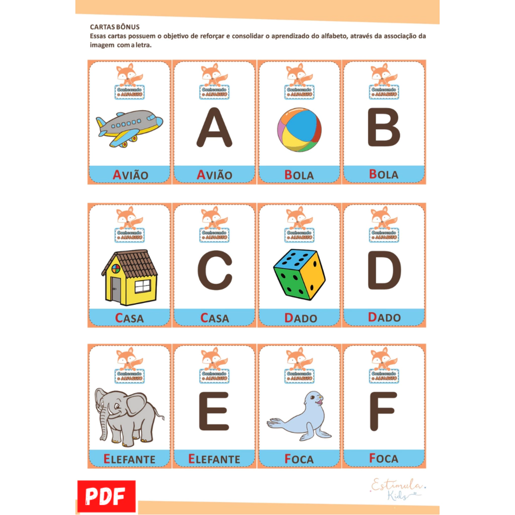 O material conta com 1 anexo que são cartas bônus de cada letra, que funciona como jogo da memória entre figura e letra inicial, com o objetivo de fixação, incentivo e valorização da realização da tarefa.