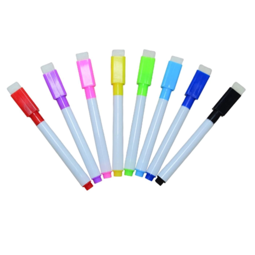 A caneta de Quadro Branco é perfeita para escrever em lousas, pois seu tamanho é adequado à mãozinha da criança. Todas as canetas possuem a tinta de mesma cor da tampa, na ponta da tampa encontra-se uma espuma para apagar.