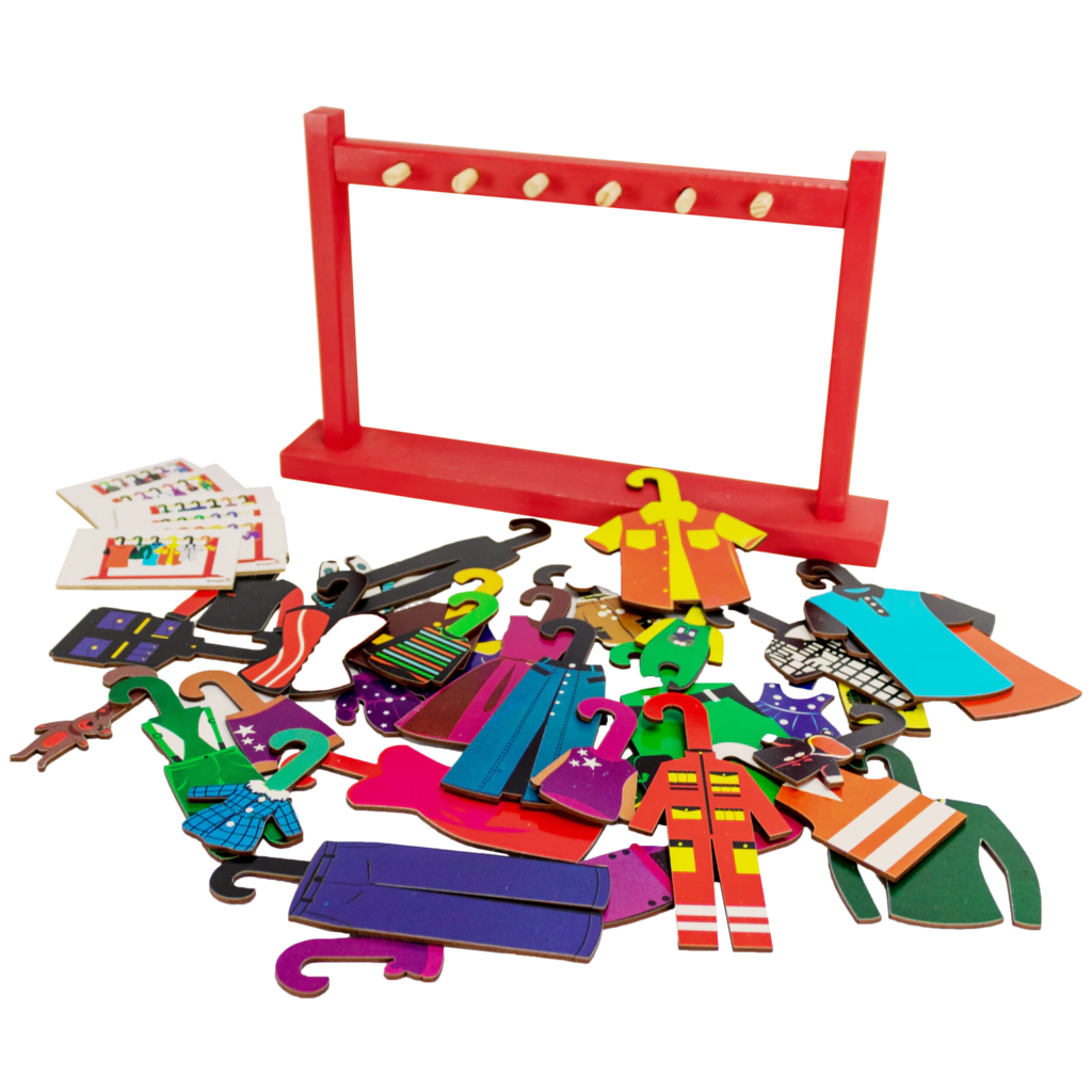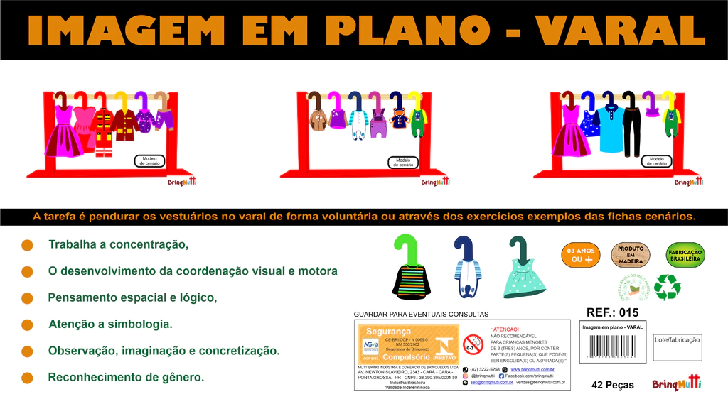 A tarefa é pendurar os vestuários no varal de forma voluntária ou através dos exercícios exemplos das fichas cenários. Trabalhando a concentração, desenvolvimento da coordenação visual e motora, do pensamento espacial e lógico, bem como atenção, observação e imaginação.