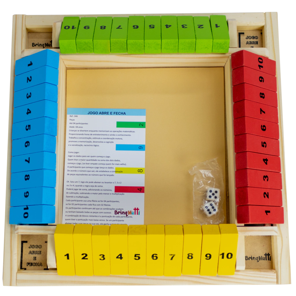 O objetivo do Jogo Abre e Fecha é fechar todas as peças numeradas ao jogar os dados ou ter a pontuação mais baixa ao finalizar o jogo.