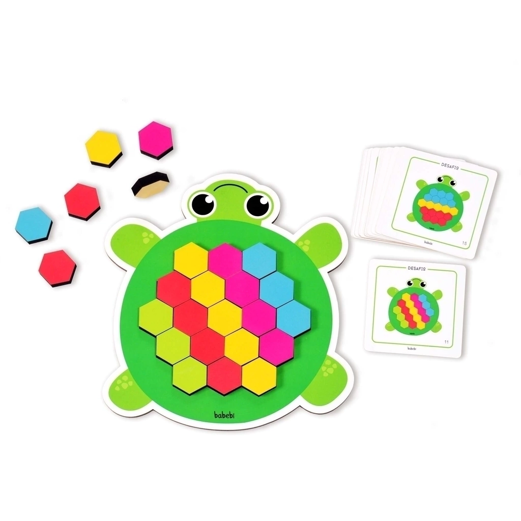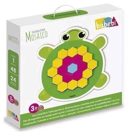 Uma simpática Tartaruguinha e diversas peças coloridas para montar e brincar com o mosaico. São 24 sugestões de design para reproduzir no tabuleiro ou simplesmente deixar a imaginação e criar centenas de possibilidades.